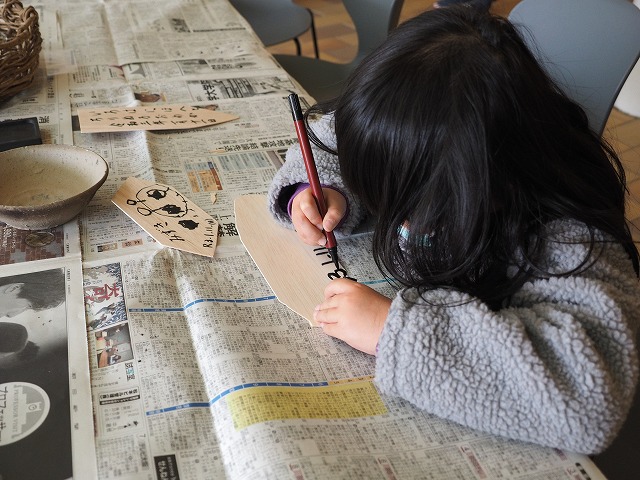 メインホールでは古代体験として、お正月らしく「木簡に書き初め」を行いました。